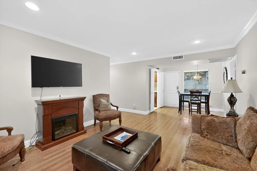 Nestled in a secure gated community, this one-bedroom, first floor unit offers peace of mind and privacy. Its central location ensures easy access to shopping centers, dining, entertainment, and major transportation routes, making it ideal for those who value both comfort and convenience. Living and Dining area have hard surface floors and a door to the covered patio viewing green space. The kitchen includes granite counter tops, travertine floors and stainless appliances. The bedroom is a nice size with walk-in closet and stack washer and dryer located in the closet. Utilities are included in the monthly HOA fees.