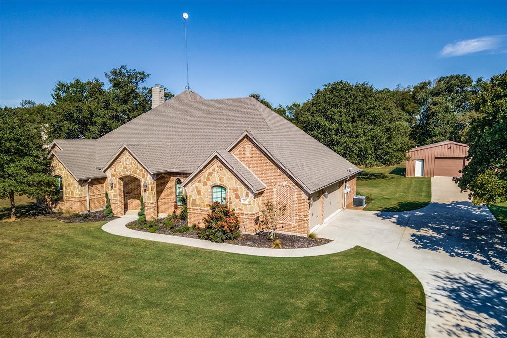 Gorgeous 4 bedroom, 2.5 bath home on a beautiful one-acre lot in Knob Hill Estates, complete with 3 car garage (with built-in cabinets) and huge 1200 sf workshop in back. The home has a spacious open floor plan with separated bedrooms. Front room with french doors can be used as an office or 4th bedroom. The kitchen includes granite countertops, farm sink, and a gas cooktop. Owner's suite includes separate vanities, deep bathtub, and large walk-in shower. Spacious laundry room.Huge back patio with fireplace. Lot backs up to lots of open land. Extended driveway to workshop, which has two large bay doors, room for parking, and also includes a bathroom. No HOA. Springtown ISD. Short distance to Azle or Springtown.