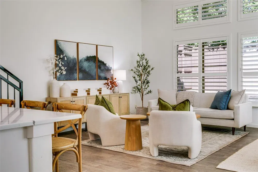 TURN KEY, LOCK & LEAVE updated Garden Home with excellent location and LOW HOA within minutes of downtown Dallas. Unsurpassed for value, comfort, convenience and quality! Close to Stevens Park Golf Course, Kessler Theater, all the eateries-shopping-fun of Bishop Arts and the Sprouts Farm Market coming soon at Hampton-Ft Worth Ave! Light, bright, open floorplan perfect for entertaining. Gorgeous Great Room boasts a vaulted ceiling and walls of energy-efficient windows. High-end Plantation shutters throughout enhance interior elegance and charm. Porcelain tile flooring, custom cabinetry from special milled building material and fresh, no-VOC paint throughout for a healthy living environment. The generous design includes a large bedroom and full bath conveniently located on the main floor. A 2nd bedroom bath are upstairs along with a flex room well suited as a third bedroom or office. Closet space is generous. Two designated parking spaces ensure hassle-free parking. Extra visitor parking is directly across by the pool. A stamped concrete patio and yard area provide a peaceful retreat. This property can't be beat for comfort, convenience and value! HOA covers front yard maintenance, community pool and clubhouse, a private dog park and water services.