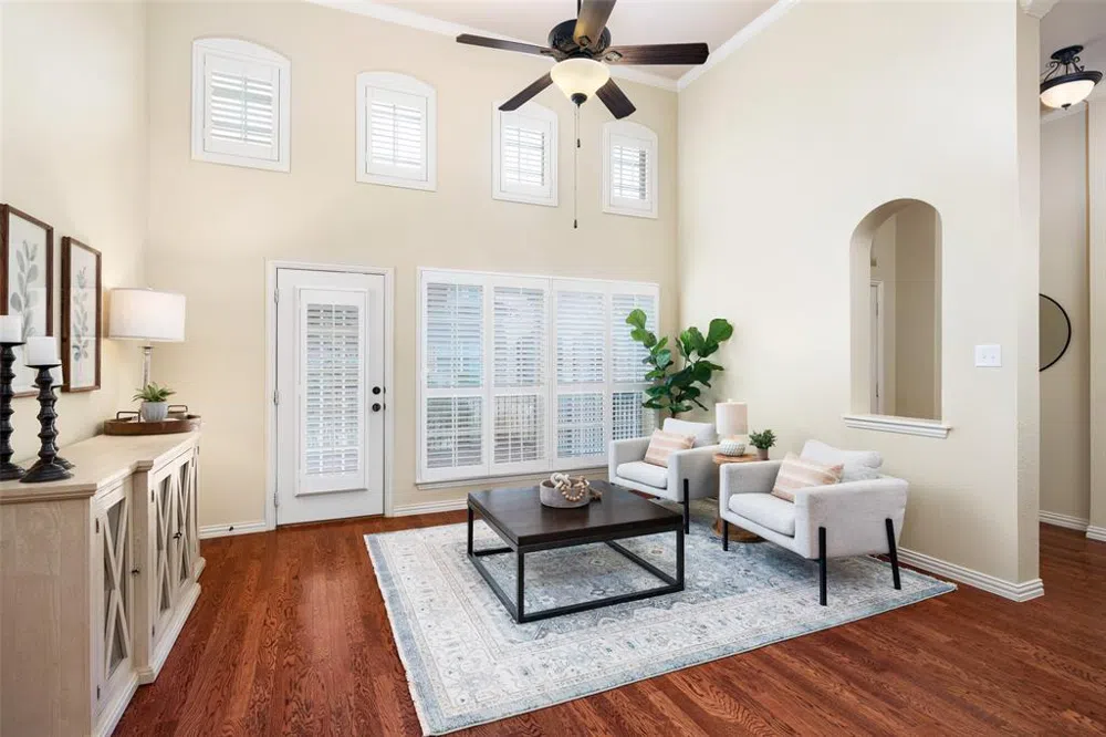 Corner unit in a fabulous gated community in the heart of Stonebridge Ranch! You'll fall in love with this single story split floor-plan with 2 bedrooms and 2 baths. Open floorplan, expansive living room, lofty ceilings + architectural details and outdoor patio w-courtyard create the perfect home! Features include: large kitchen, plantation shutters, blinds, office nook w-built in desk area, large primary closet, granite kitchen c-tops, lots of windows allowing natural light, front-side courtyard & patio area, hardwood flooring. Neighborhood is quiet and secluded and features a community pool, fitness center, clubhouse, trails, and a beautiful pond at the back of the community. Great location near restaurants, shopping, grocery stores & medical. Community has blanket insurance covering the exterior + HOA provides landscaping. HOA includes blanket insurance, all exterior maintenance, lawn care maintenance and sprinkler system.