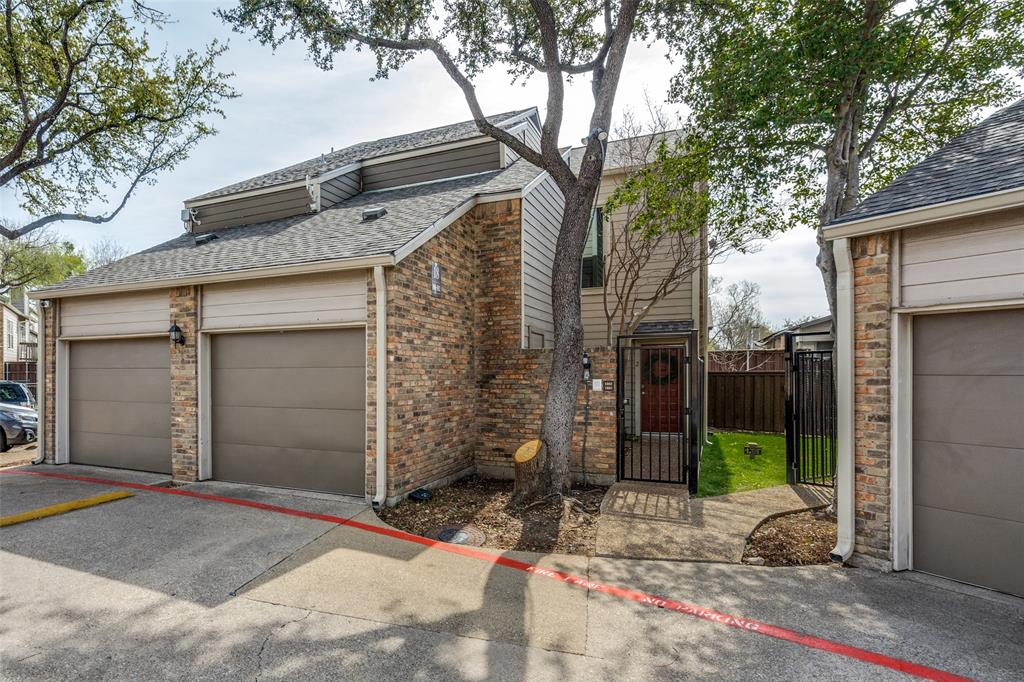 LOCATION LOCATION LOCATION! Move-in ready 2 bdrm 2 bath with 1 car private garage. Situated in back corner of gated complex next to secondary community pool. As you enter from the ground level gated courtyard the inside stairs will lead you up to living areas. This beautiful unit features an open floor plan with a vaulted ceiling and skylights, lots of natural light, laminate wood floors in living and dining area, split bedrooms, dining area, kitchen with granite counters, SS appliances and fridge, and a utility room with washer and dryer included. The primary bedroom has an ensuite bath and 2 closets as well as a storage area. Unit overlooks the pool from the East side. HOA replaced entire balcony March 2023. Recent upgrades include carpeting throughout, fresh paint (incl. trim), all windows replaced with energy efficient windows, garage door, patio door and garbage disposal. Located in prime area of North Dallas with easy access to DNT and LBJ. Easy walk to shopping and restaurants.