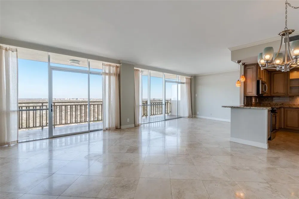 Nicely updated 2 bedroom, 2 bath condo with 28th floor treetop views of Preston Hollow offers floor to ceiling windows, an expansive balcony, and an open floor plan that's perfect for both entertaining, and quiet nights at home. This iconic building is walkable to all of the convenient shopping and dining that Preston Center has to offer. A lock-and-leave lifestyle with a 24 hour concierge, and easy access to the Park Cities and Preston Hollow; you'll be proud to call this Home. **HOA dues include all utilities and Wi-Fi. Washer and dryer in unit; 1 assigned garage parking space.